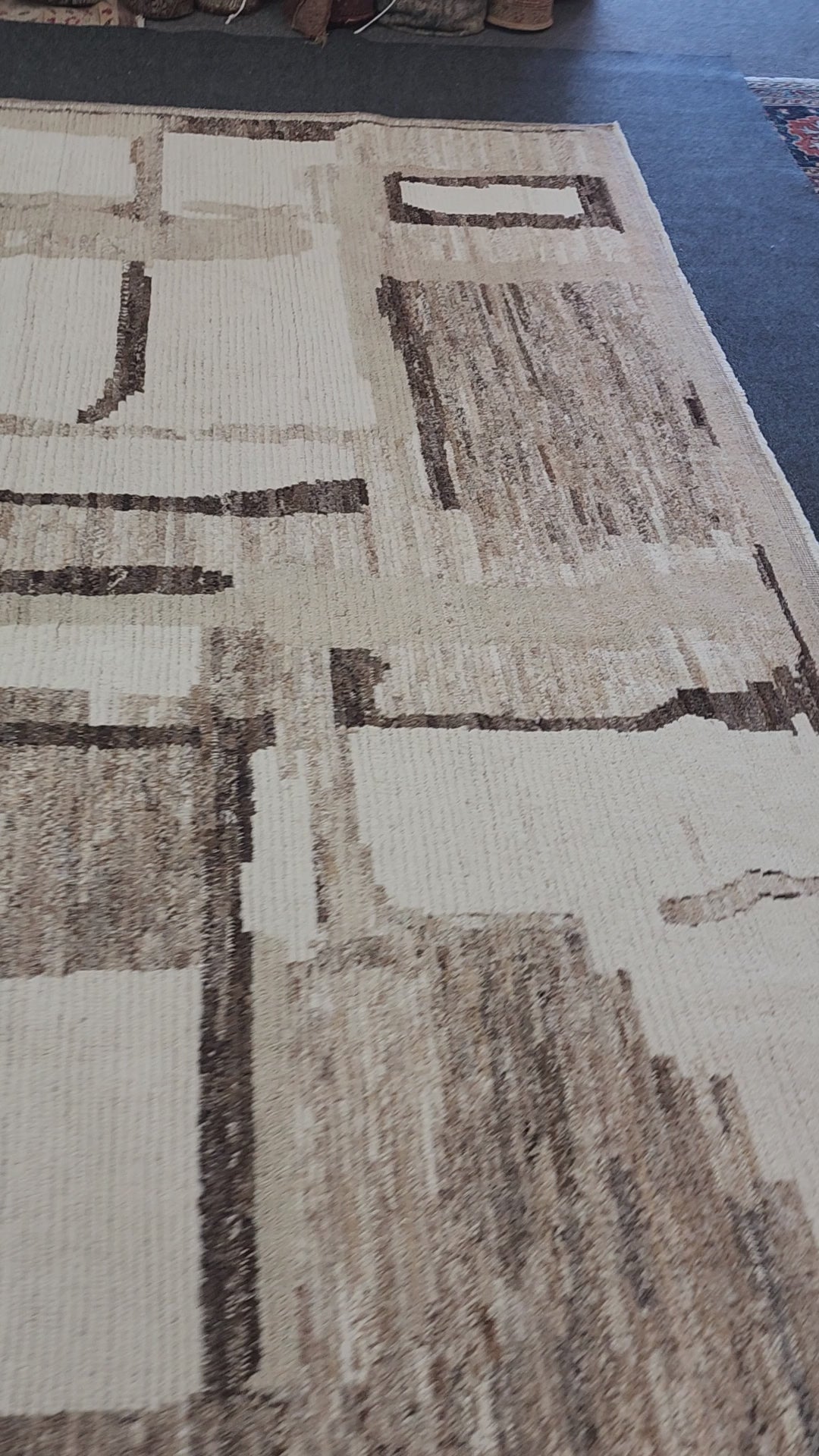 Elevate your space with the bold yet subtle sophistication of this Abstract Moroccan Modern Rug. Measuring 10 x 14 feet, this contemporary masterpiece blends traditional Moroccan weaving techniques with an abstract, geometric design that feels distinctly modern. Its interplay of neutral tones—cream, beige, and taupe—creates a striking architectural pattern that brings depth and texture to your space.