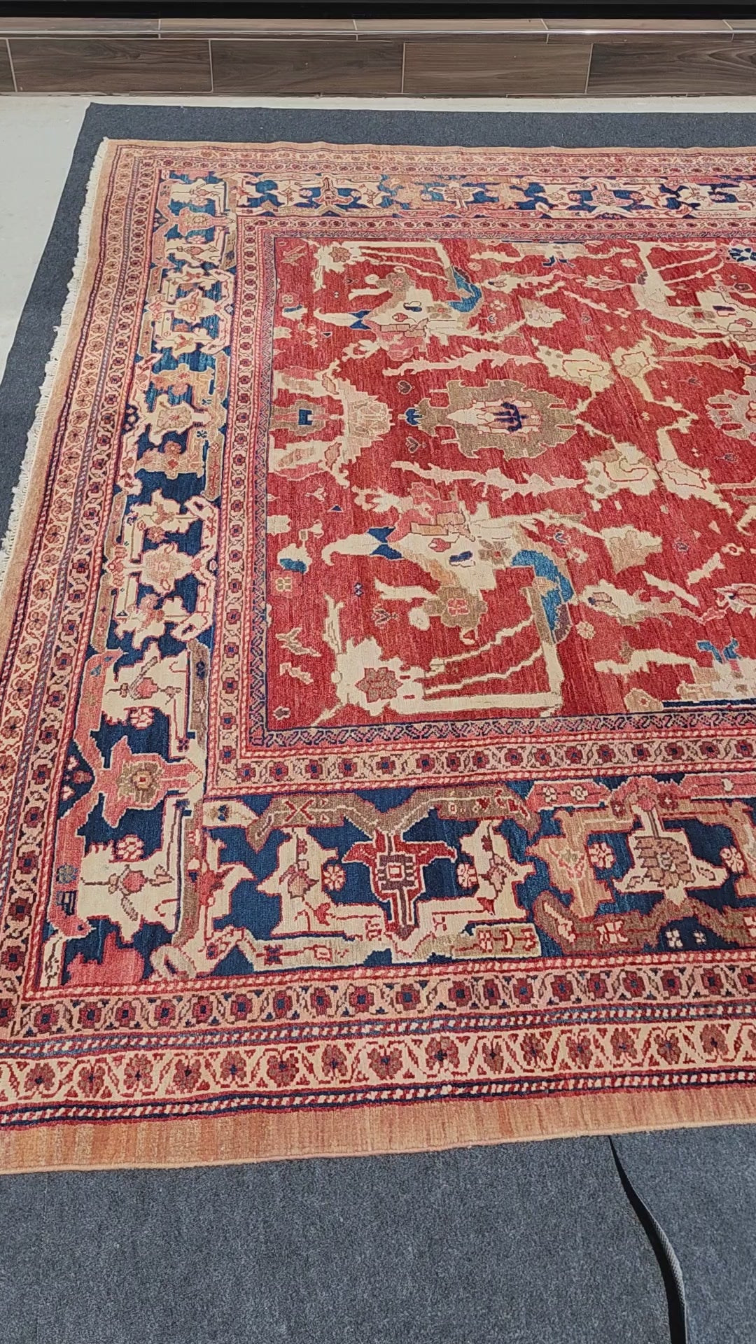 This stunning Vintage Bakshaish Design Rug in 9.8 x 14 feet embodies the rich heritage and artistry of Persian tribal weaving. The rug features a striking brick-red field adorned with bold, angular motifs and geometric medallions, characteristic of Bakshaish craftsmanship. Surrounding the field is a deep navy border, intricately decorated with stylized floral and vine patterns, offering a vivid contrast to the central design.