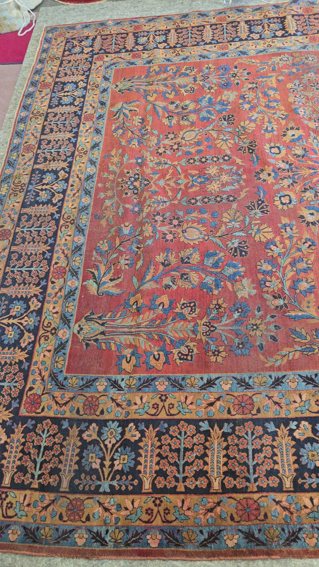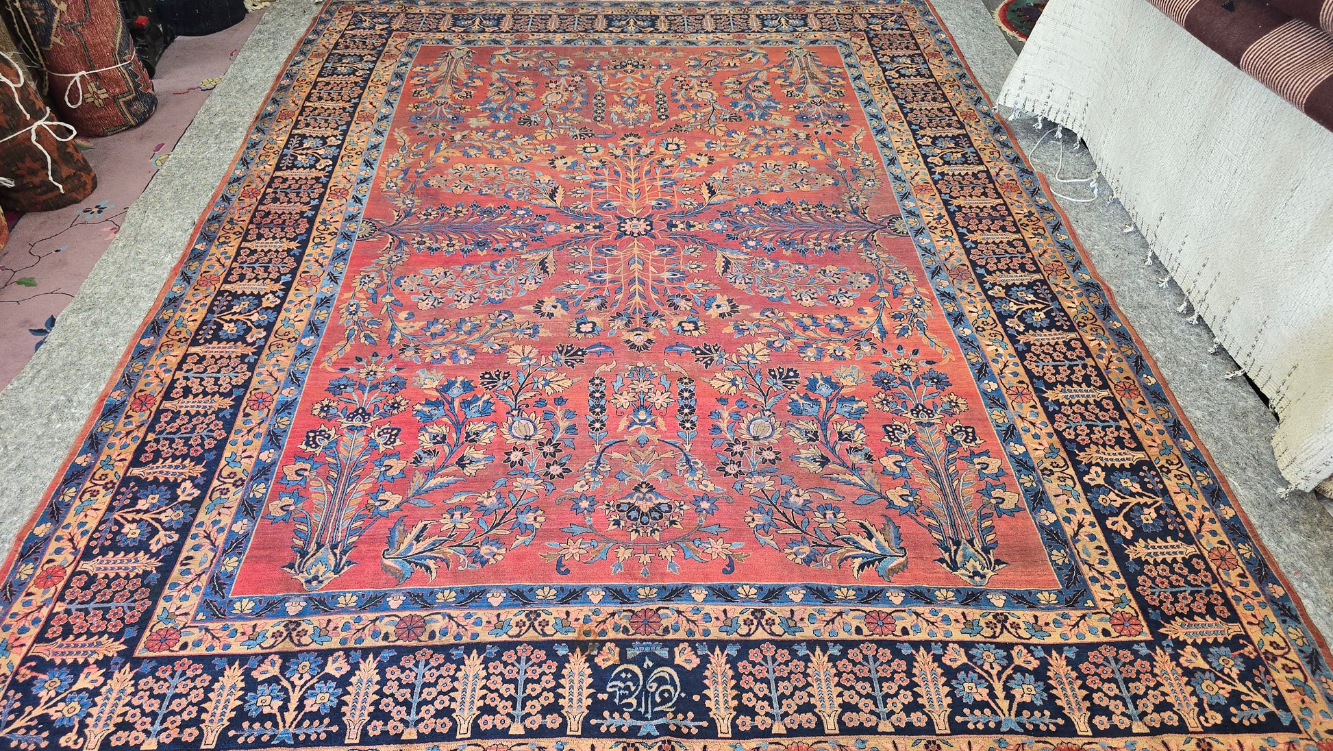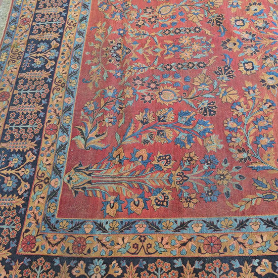 This Antique Persian Kashan Rug, measuring 9x12 feet, is a quintessential example of Persian rug artistry. The design features a striking navy-blue floral vine set against a vibrant rust field, with intricate floral vines and arabesques gracefully weaving across the surface. The delicate symmetry and detailed craftsmanship reflect the timeless elegance that Kashan rugs are celebrated for.