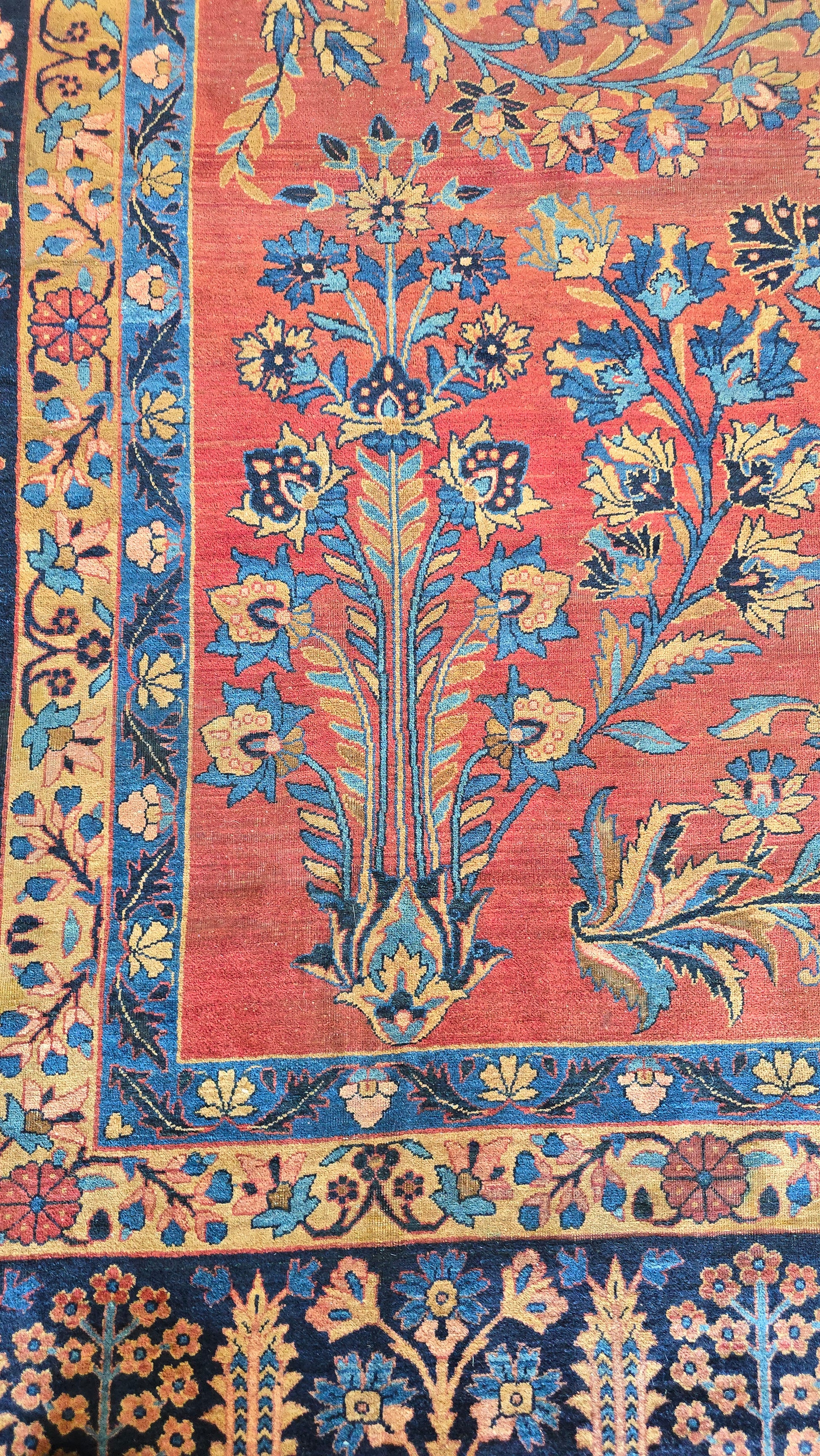 The rich crimson border frames the piece, adding a layer of bold contrast, while the soft ivory and pastel accentsprovide balance and subtlety. This rug exemplifies the classic Persian all over design, with fine floral detailing that draws the eye toward the heart of the composition.