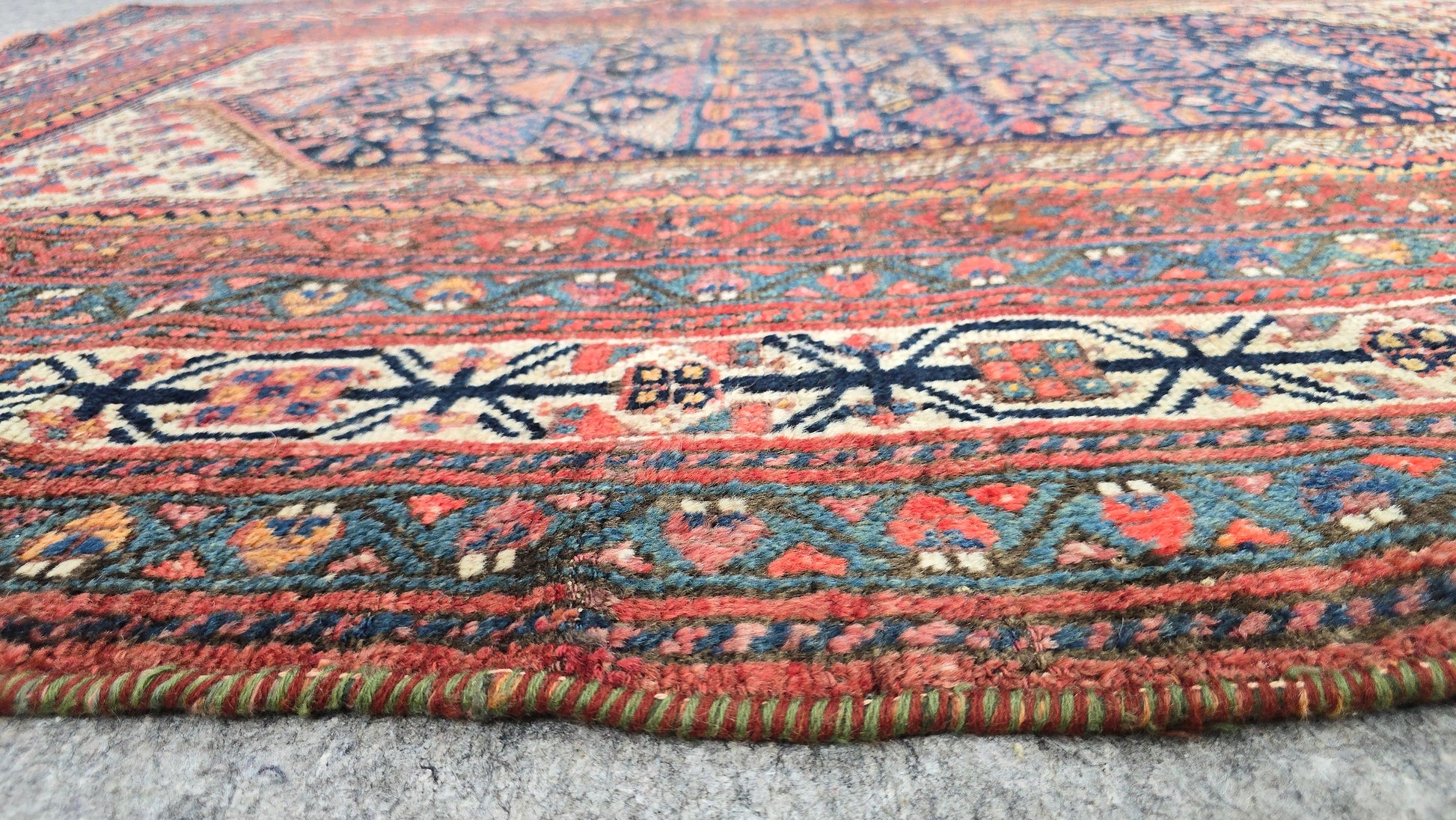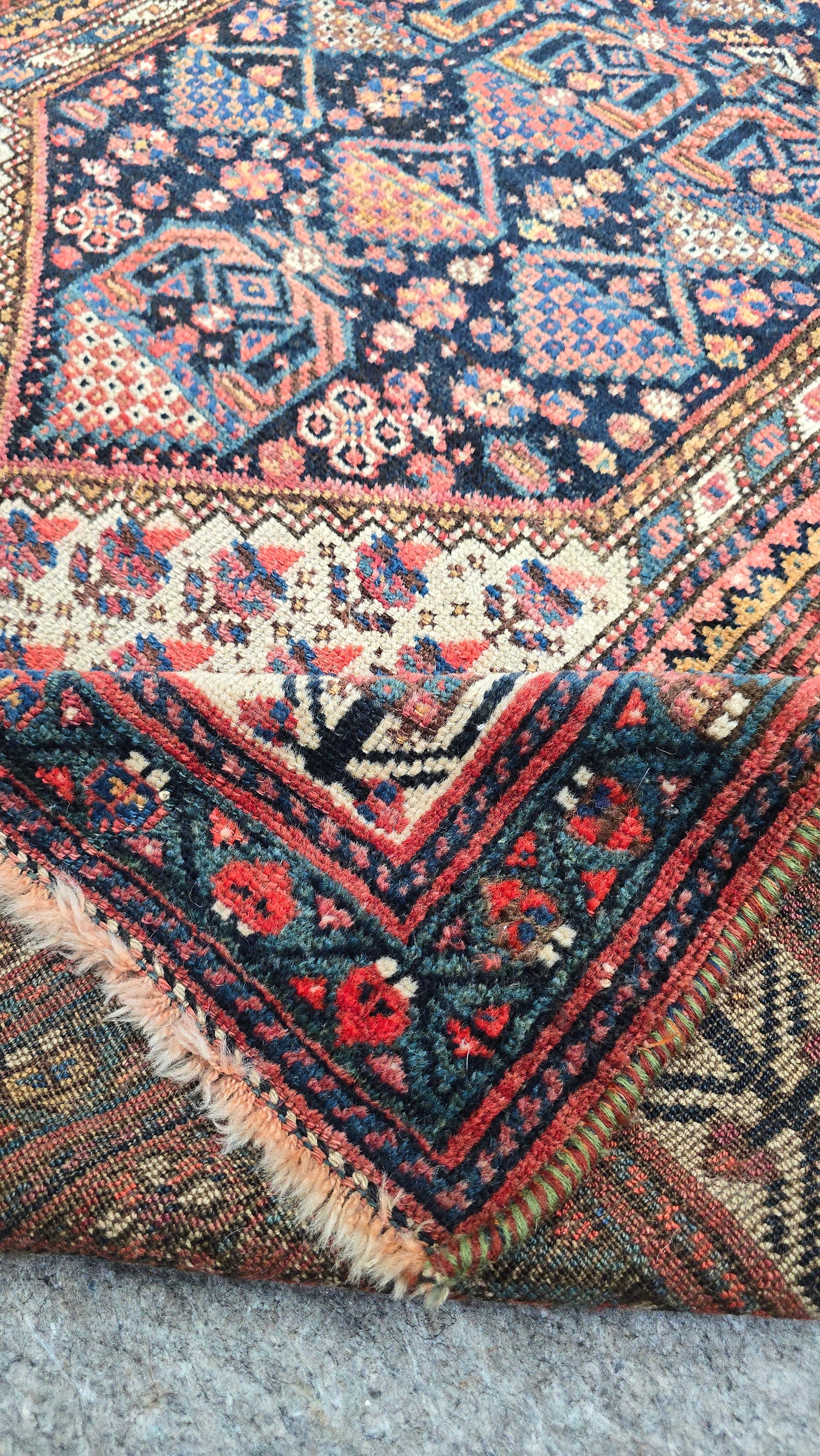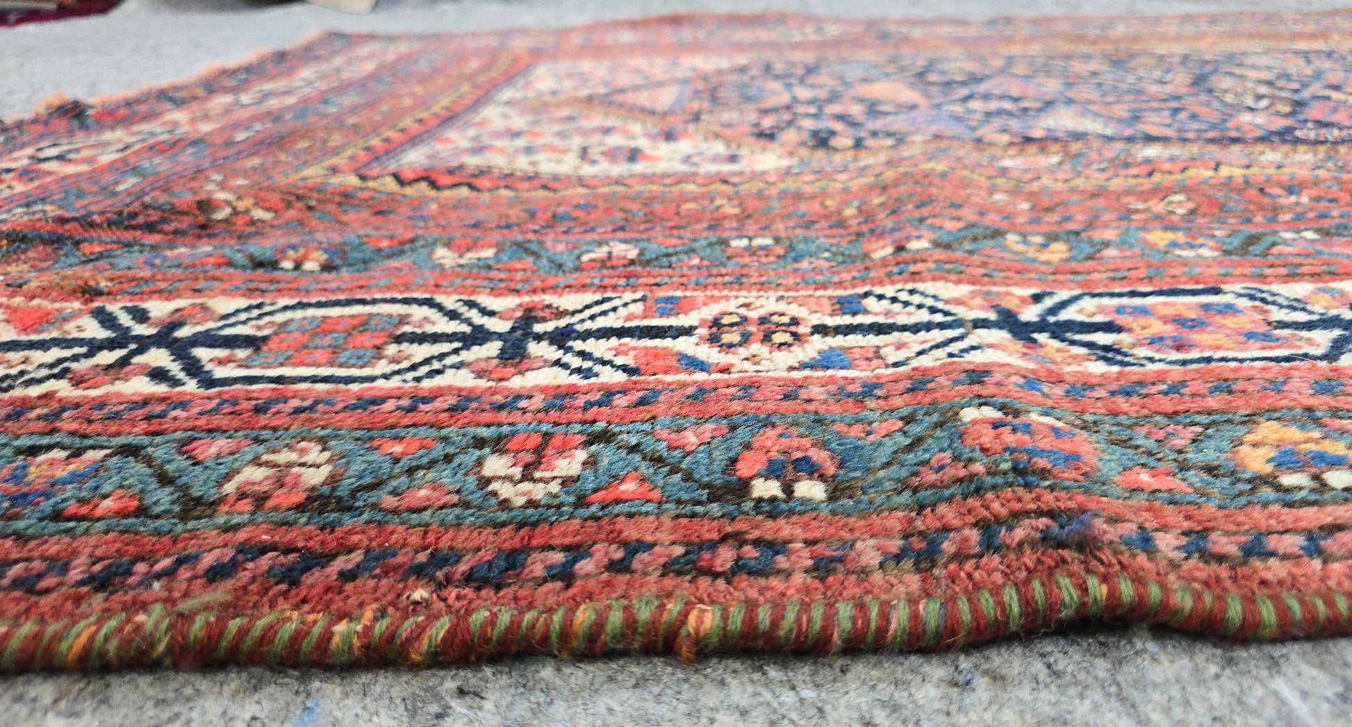 Enhance your home with the rustic beauty and intricate design of this Early 1900s Luri rug – a rare and elegant addition to any collection.