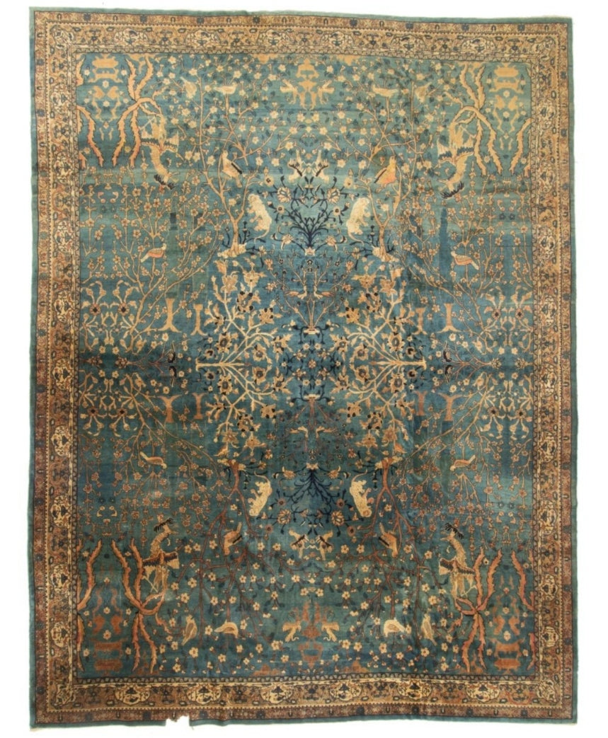 - Design: All-over floral and vine design with animals and birds intricately woven throughout the field
