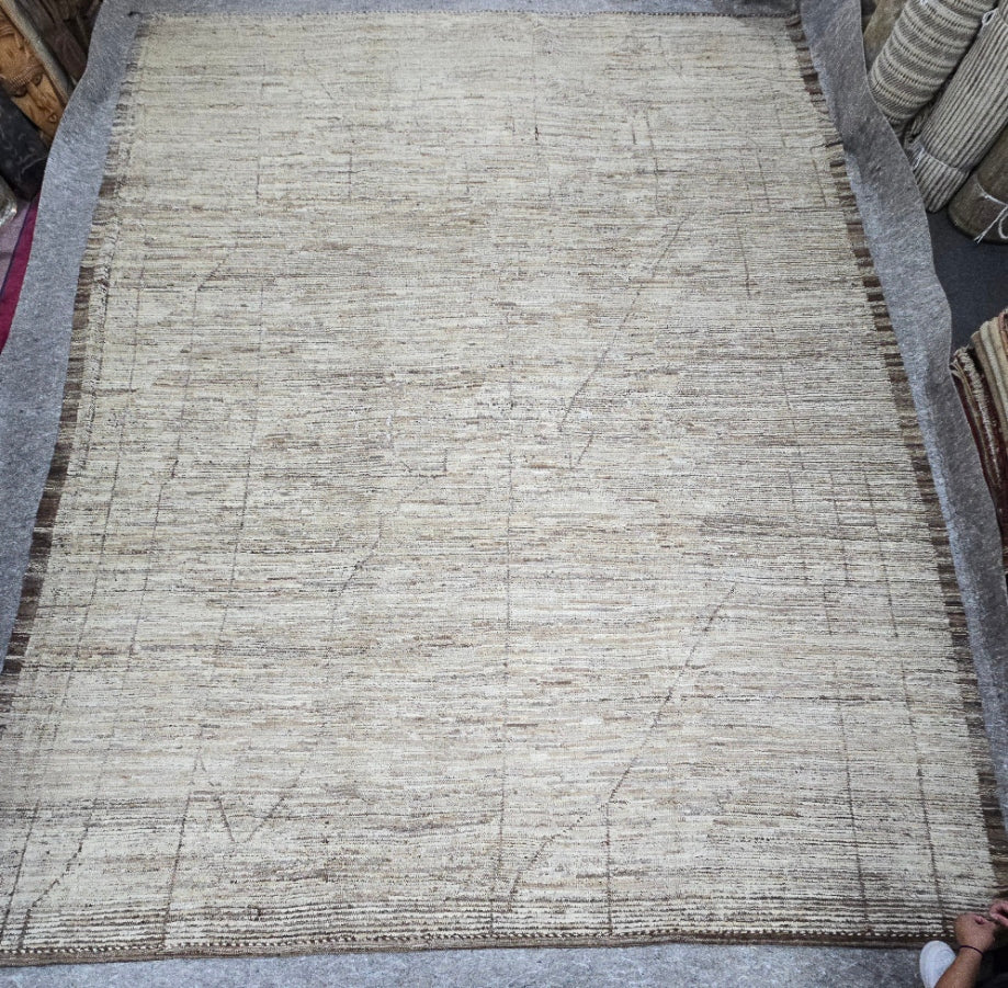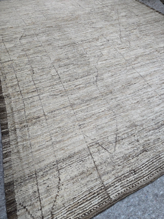 Crafted by Afghan artisans using natural wool, this rug offers unparalleled softness, durability, and timeless appeal. Its neutral palette and large size make it ideal for anchoring spacious living rooms, dining areas, or bedrooms, adding warmth and sophistication to your home.
