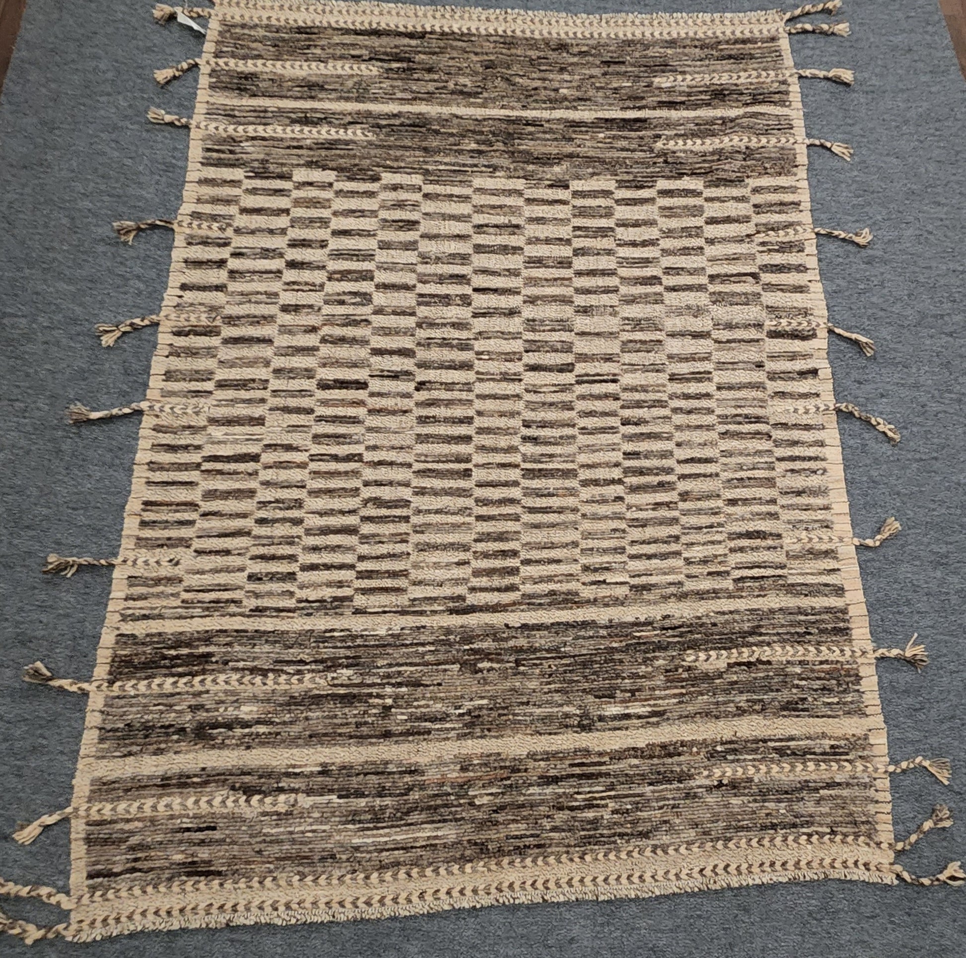 Introduce warmth and texture to your space with this Handwoven Moroccan Area Rug, measuring 6.8 x 7.8 feet. Featuring an intricate combination of checkerboard and striped patterns in rich, earthy brown and cream tones, this rug reflects the timeless artistry of Moroccan craftsmanship. The braided accents along the edges and fringe details enhance its organic, handmade charm.