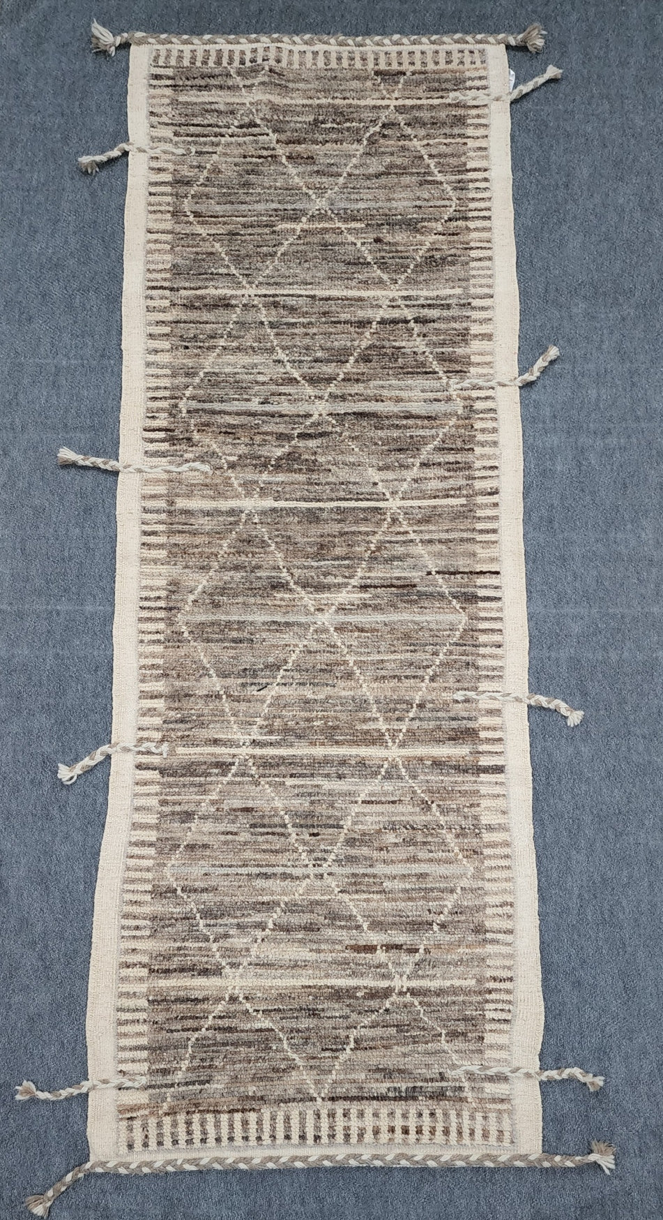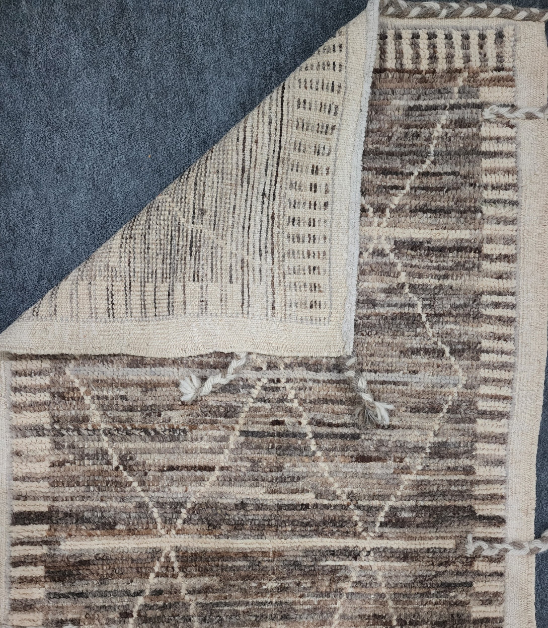 Bring warmth and artisan beauty to your home with this 2.9 x 8.6 Moroccan runner, featuring a striking diamond lattice pattern. The rich earthy brown tones are accented by ivory borders and geometric detailing, creating a timeless and elegant design that blends tradition with modern simplicity.