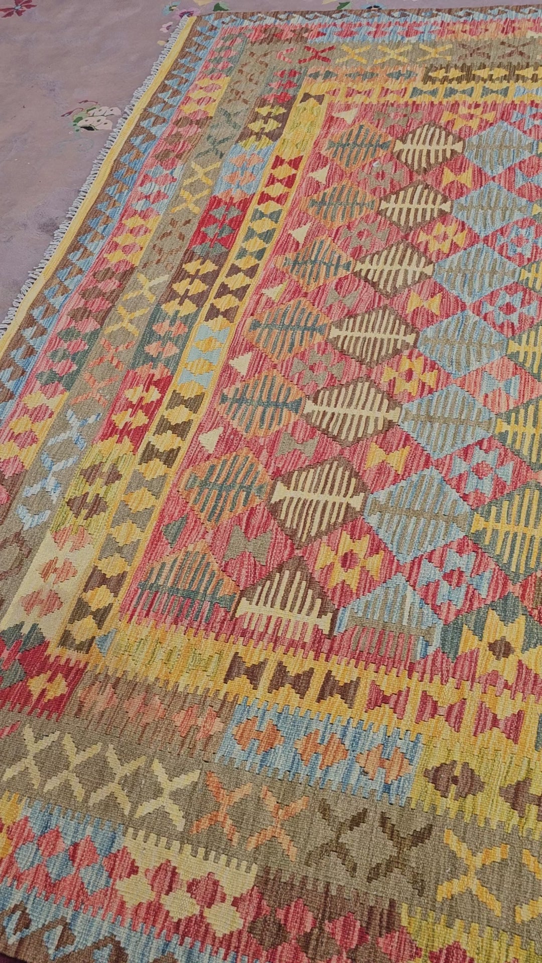Introduce a splash of vibrant tradition to your space with this stunning Afghan Maimana Kilim, handwoven to perfection by skilled artisans. This colorful flatweave rug embodies the rich heritage of Afghan craftsmanship, showcasing intricate geometric patterns and a lively palette that reflects the spirit of nomadic life.