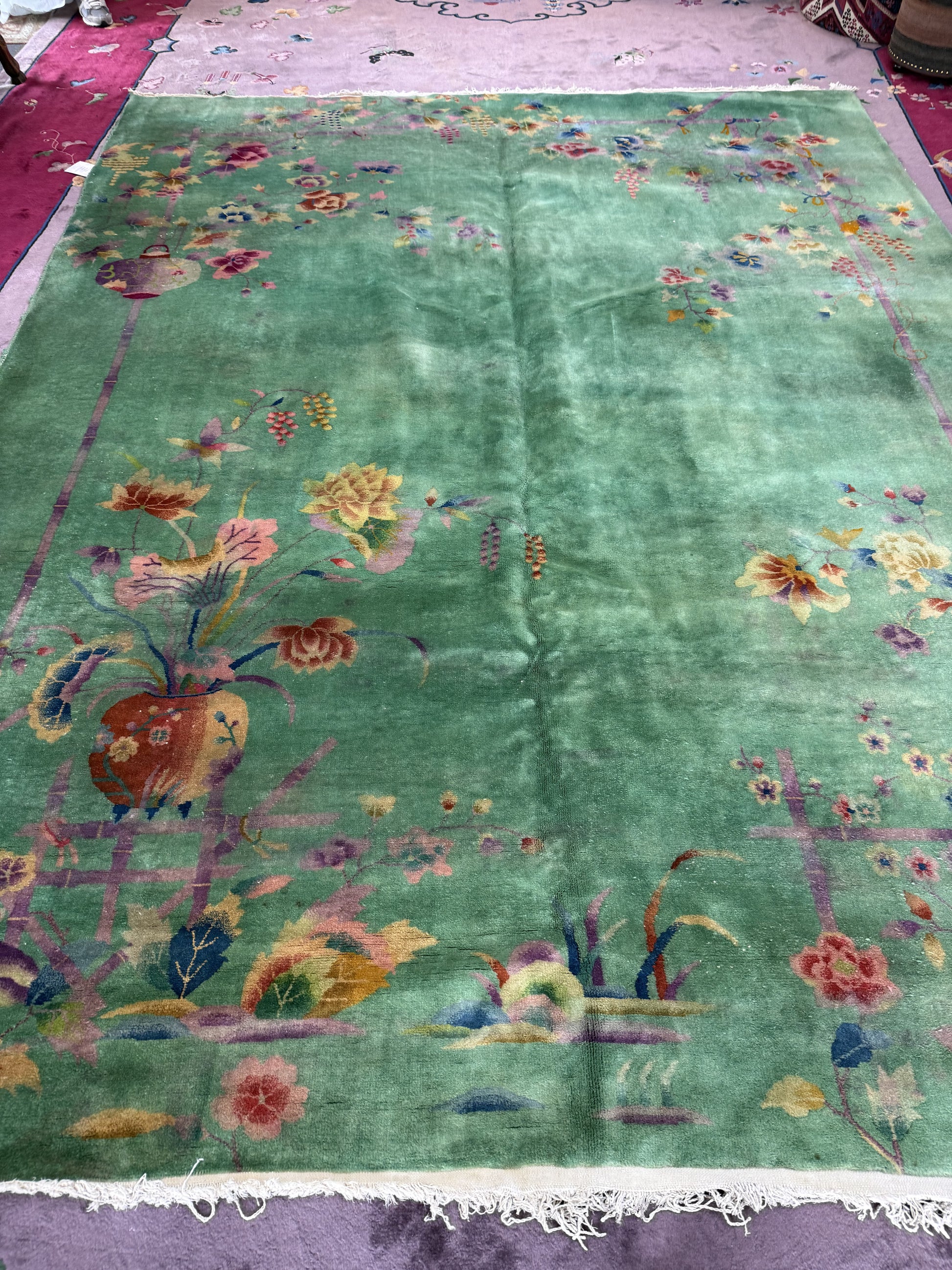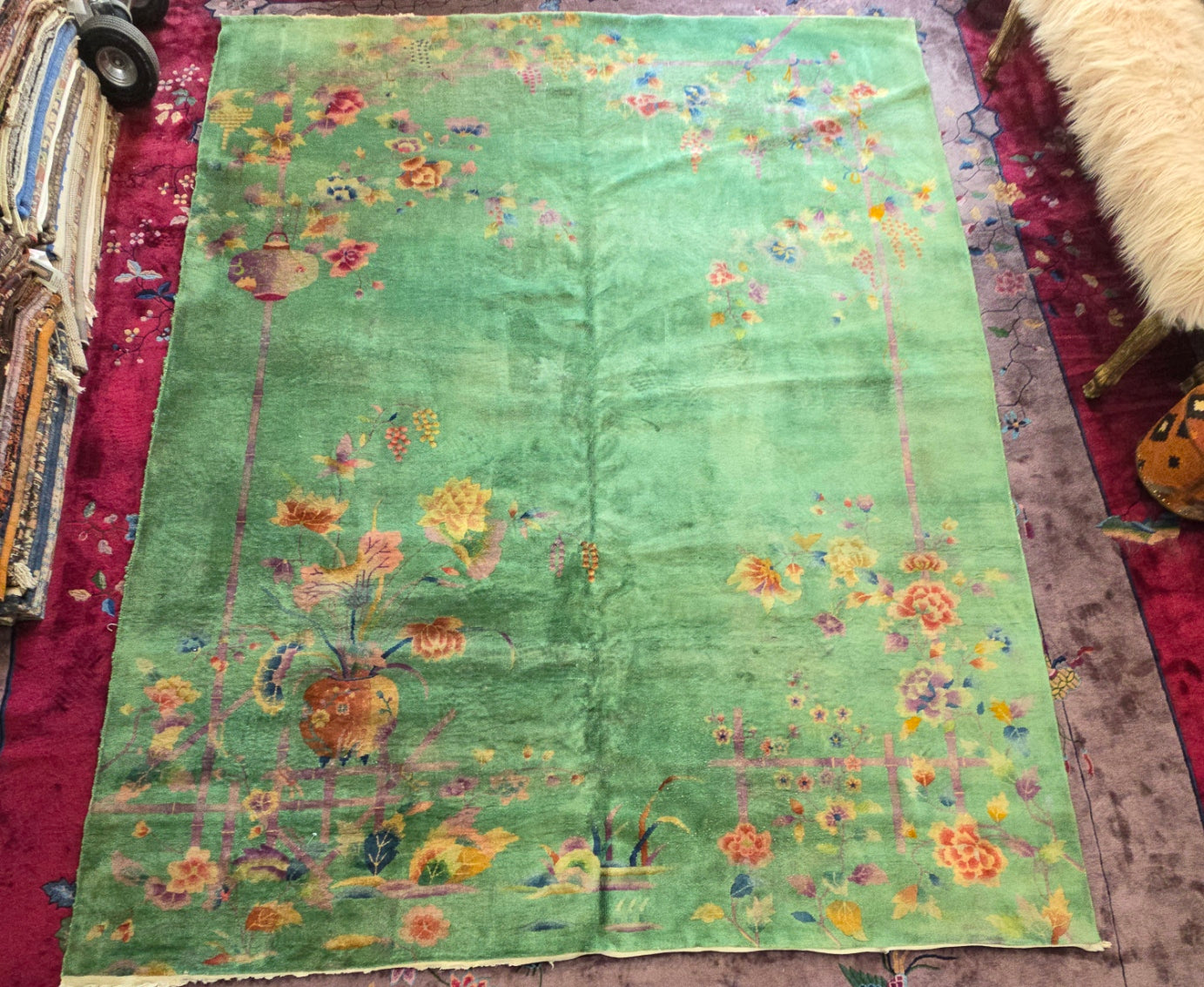 The most recognizable rugs from the 1920s and 1930s are Chinese Rugs made by Walter Nichols. These Nichols rugs, as they came to be known, were primarily made during the Art Deco movement in the early 20th Century. They were usually made of wool and silk and depicted floral designs in very rich, bold colors like magenta, turquoise, emerald, canary and ruby. They either had a very thick border or none at all. Nichols specialized in a mechanized wool spinning technique that produced a very thick strand - ideal for rugs. He was inspired by the works of many Art Deco artists and began to incorporate some classic deco motifs into his designs. Nichols rugs became wildly popular in the Art Deco era - they were luxurious and exotic - the epitome of Art Deco style.