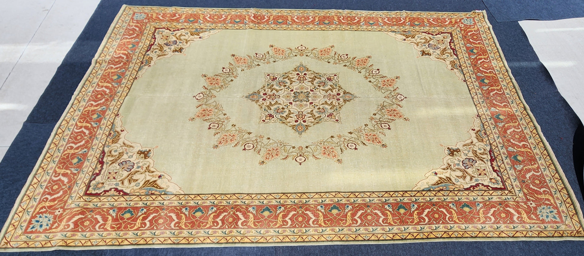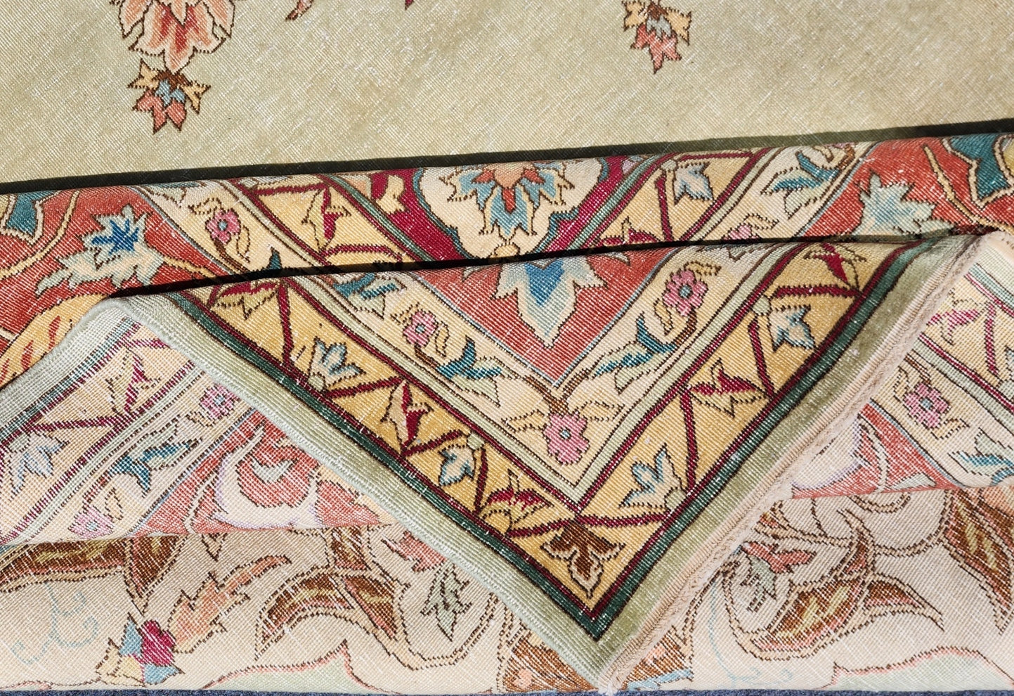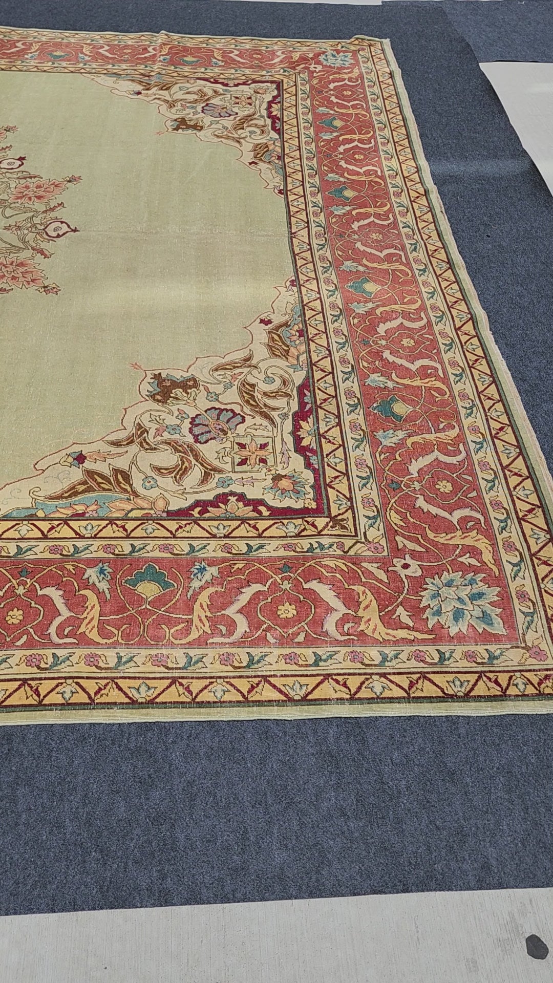 This exquisite Persian Kerman Lavar Rug is a testament to the fine craftsmanship that defines the Kerman weaving tradition. Measuring 10 x 13 feet, the rug showcases a delicate floral medallion centered on a soft pistachio green field, encircled by intricate floral vines. The border features a rich terracotta red accented with soft blues and creams, creating a striking yet balanced frame.