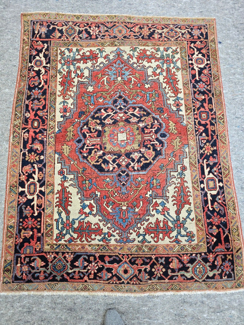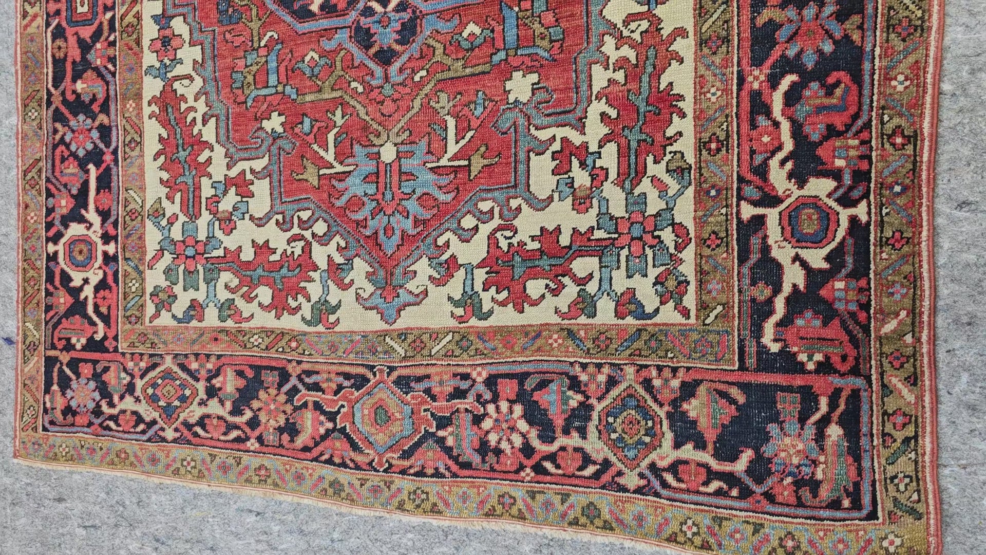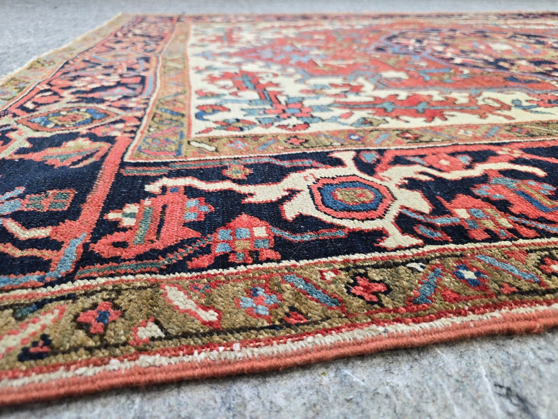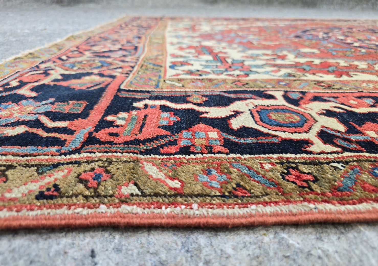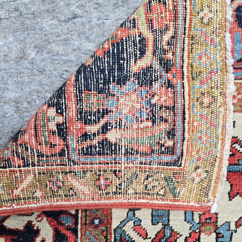 Serapi rugs, originating from the Heriz region of Persia (modern-day Iran), are celebrated for their bold geometric patterns and exquisite craftsmanship. This rug features a large medallion with angular floral motifs, framed by an elaborate midnight blue border adorned with rosettes and palmettes. The corner spandrels showcase detailed botanical motifs, creating a balanced and symmetrical design that reflects the artistry of 19th-century Persian weavers.