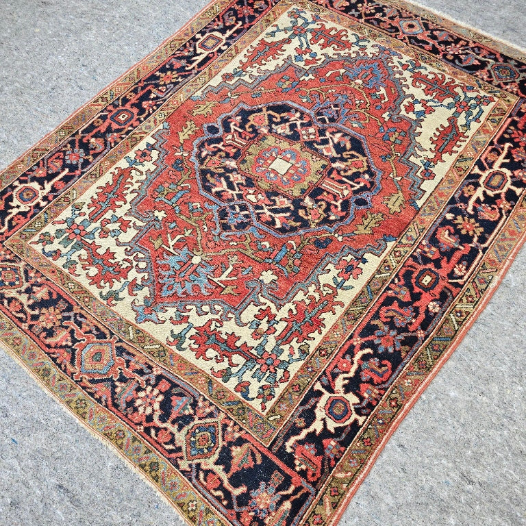 Add timeless sophistication to your home with this 19th-century antique Persian Serapi rug, a breathtaking example of masterful craftsmanship and tribal artistry. Measuring 5.2 x 6.10 feet, this hand-knotted piece boasts a striking central medallion design, set against a rich red field, complemented by intricate floral and vine patterns in navy, ivory, and soft blues.