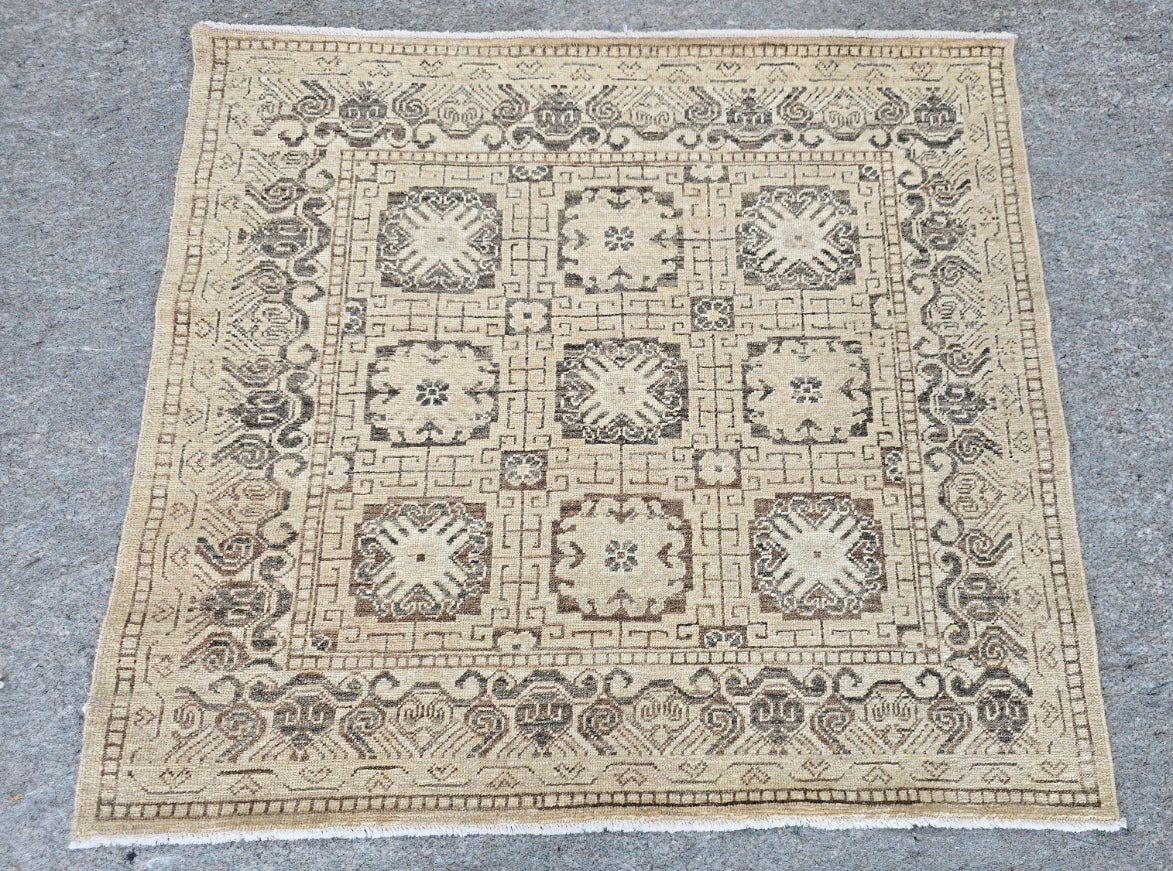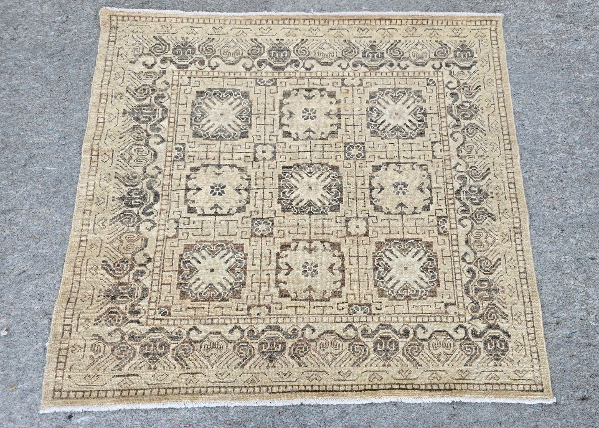 Elevate your space with this Afghan Traditional Teawash Rug, a beautiful blend of classic design and rich, warm hues. Measuring 3 x 4 feet, this hand-knotted masterpiece showcases a striking Cream Grey field adorned with intricate floral motifs and scrolling vines, framed by a soft golden border. The teawash finish gives the rug a subtle aged patina, enhancing its depth and vintage appeal.