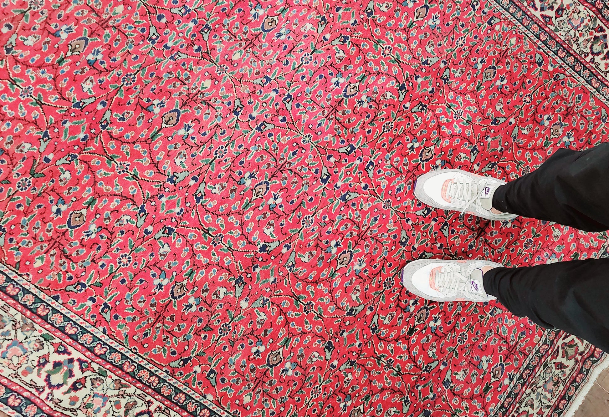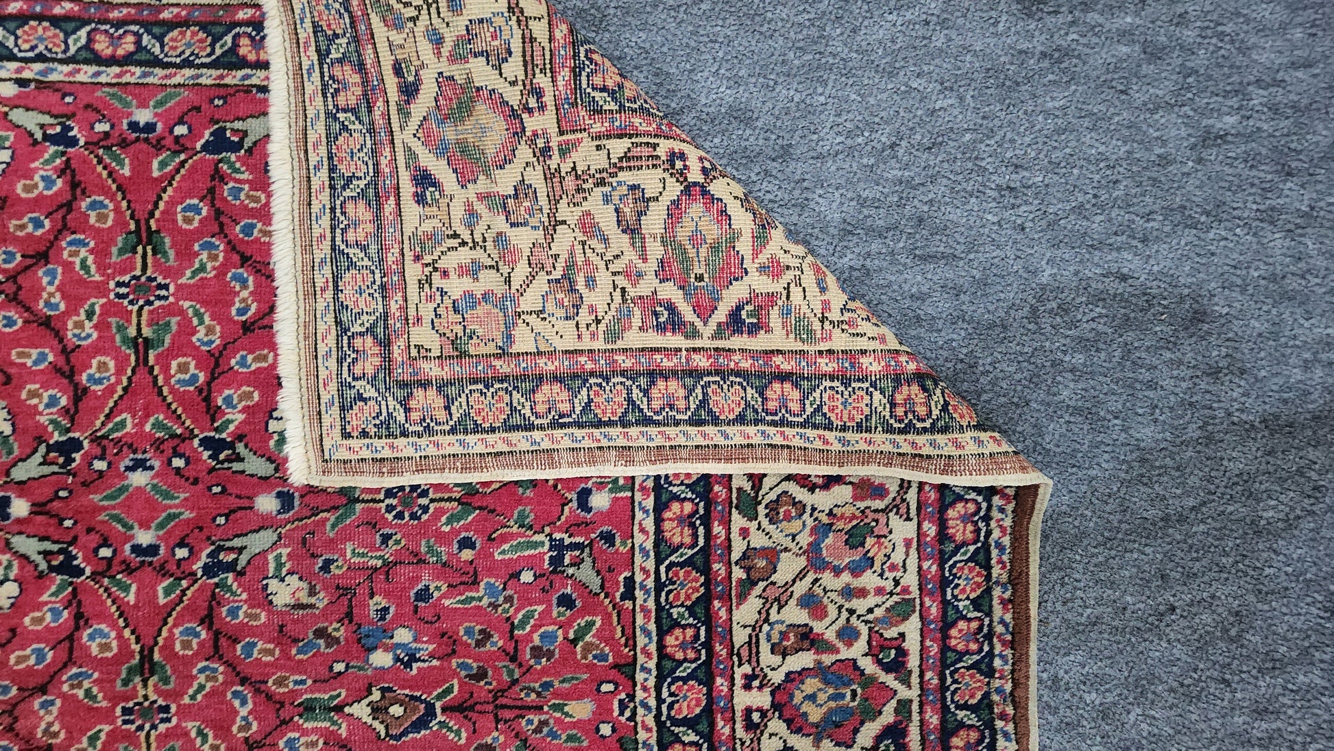 Woven in Kayseri, Turkey, this rug highlights the region’s reputation for producing delicate, detailed patterns and fine knot work. The rug’s dense floral motif, reminiscent of blossoming gardens, reflects the influence of Persian design elements, adapted through the lens of Turkish artistry. The border showcases intricate vines and blossoms, harmonizing beautifully with the vibrant central field.