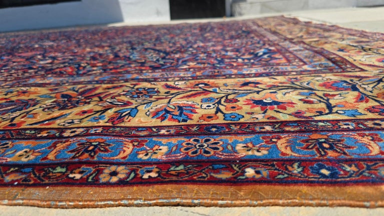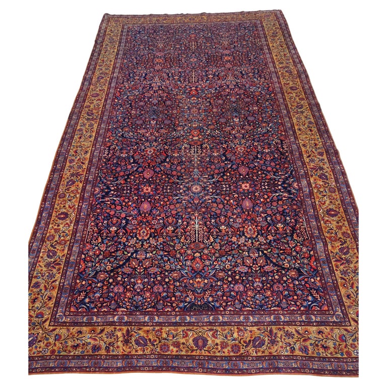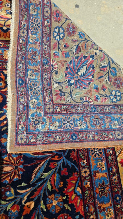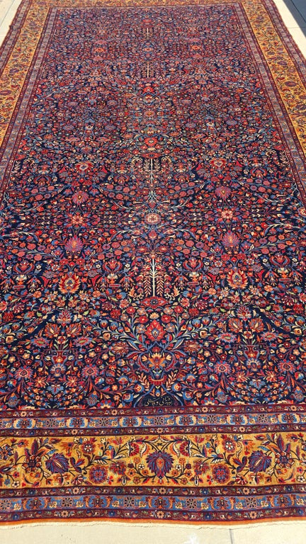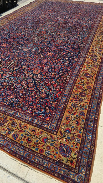 This Vintage Persian Kashan Rug, measuring 10 x 20 feet, is a quintessential example of Persian rug artistry. The design features a striking navy-blue field set against a vibrant red field, with intricate floral vines and arabesques gracefully weaving across the surface. The delicate symmetry and detailed craftsmanship reflect the timeless elegance that Kashan rugs are celebrated for.